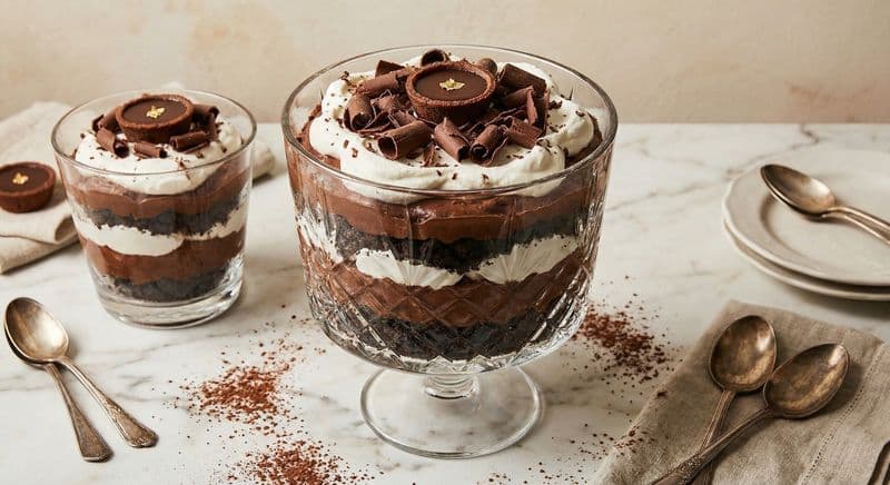 Couches alternées de tartelettes Delistar émiettées, crème au chocolat et chantilly.
